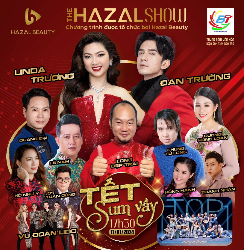 Đêm nhạc The Hazal Show dự kiến diễn ra ngày 17-1 tại Bến Tre, với sự góp mặt của ca sĩ Đan Trường, nhóm hài Long đẹp trai – Lê Nam, nghệ sĩ Chung Tử Long, ca sĩ Dương Hồng Loan, ca sĩ Quang Đại, ca sĩ Hồ Như Ý…